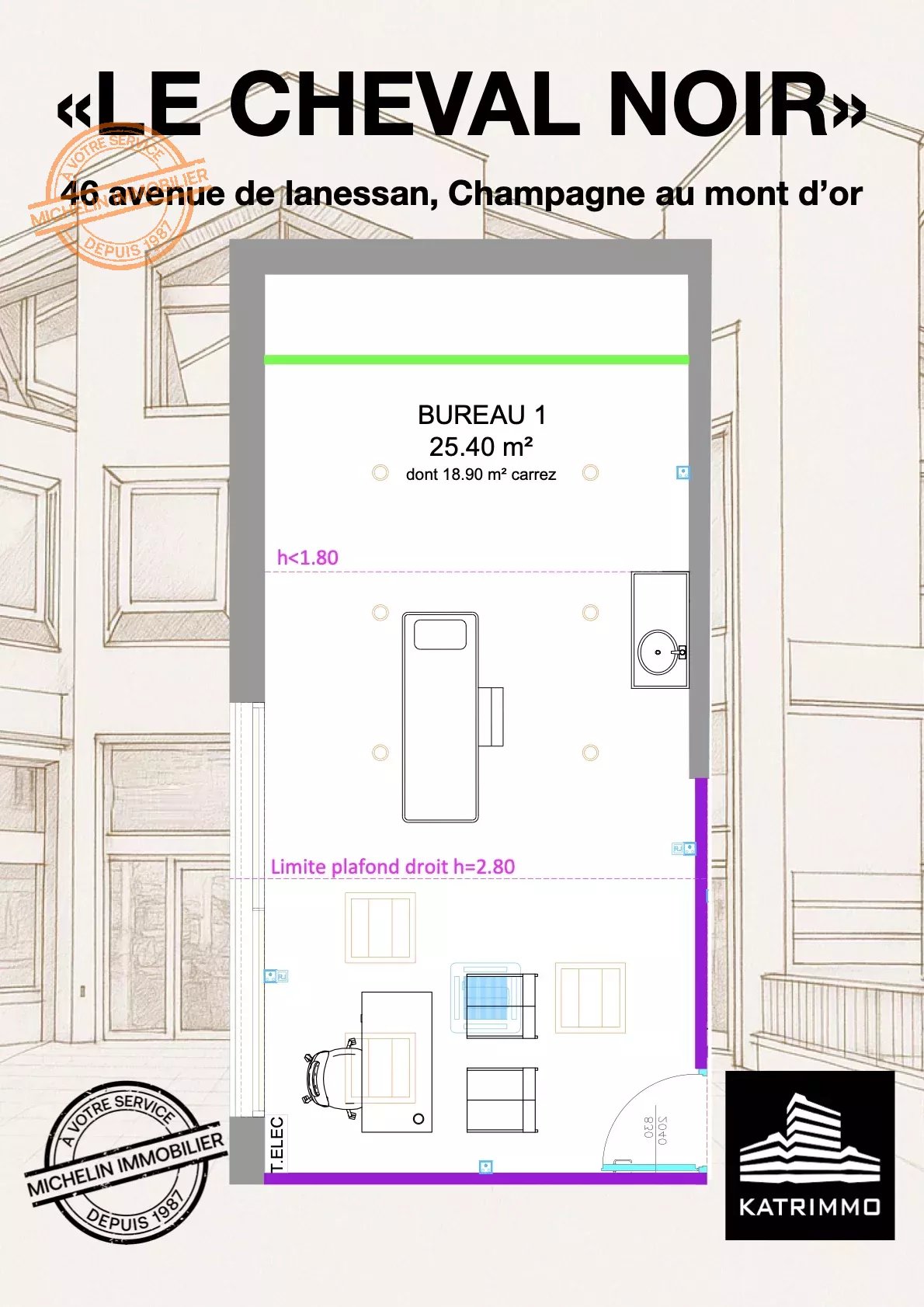 Au coeur de champagne au mont d'or, au dernier étage de l'immeuble emblématique "Le cheval noir" (46 avenue de lanessan), dans un ensemble professionnels de 14 bureaux réservés aux professionnels de santé (médical, paramédical ...)