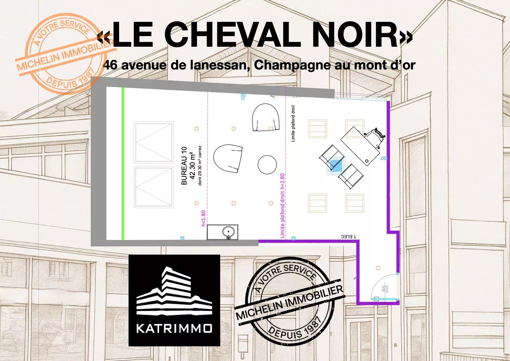 Au coeur de champagne au mont d'or, au dernier étage de l'immeuble emblématique "Le cheval noir" (46 avenue de lanessan), dans un ensemble professionnels de 14 bureaux réservés aux professionnels de santé (médical, paramédical ...)
